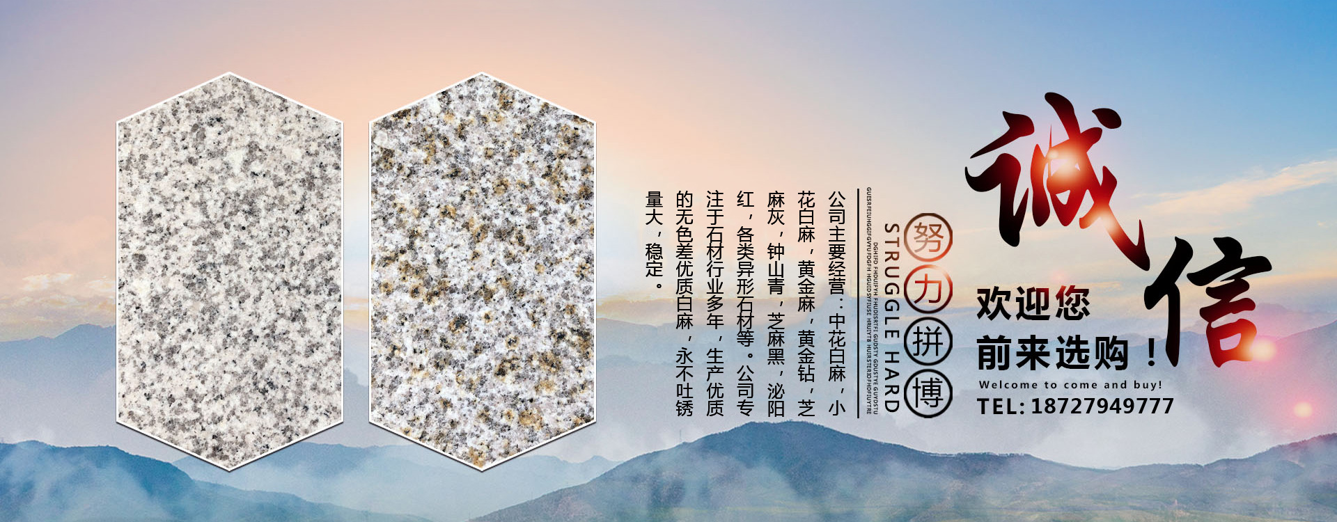 我廠主要經(jīng)營中花白麻,小花白麻,黃金麻,黃金鉆,芝麻灰,鐘山青,芝麻黑,泌陽紅,各類異形石材等;類目繁多。